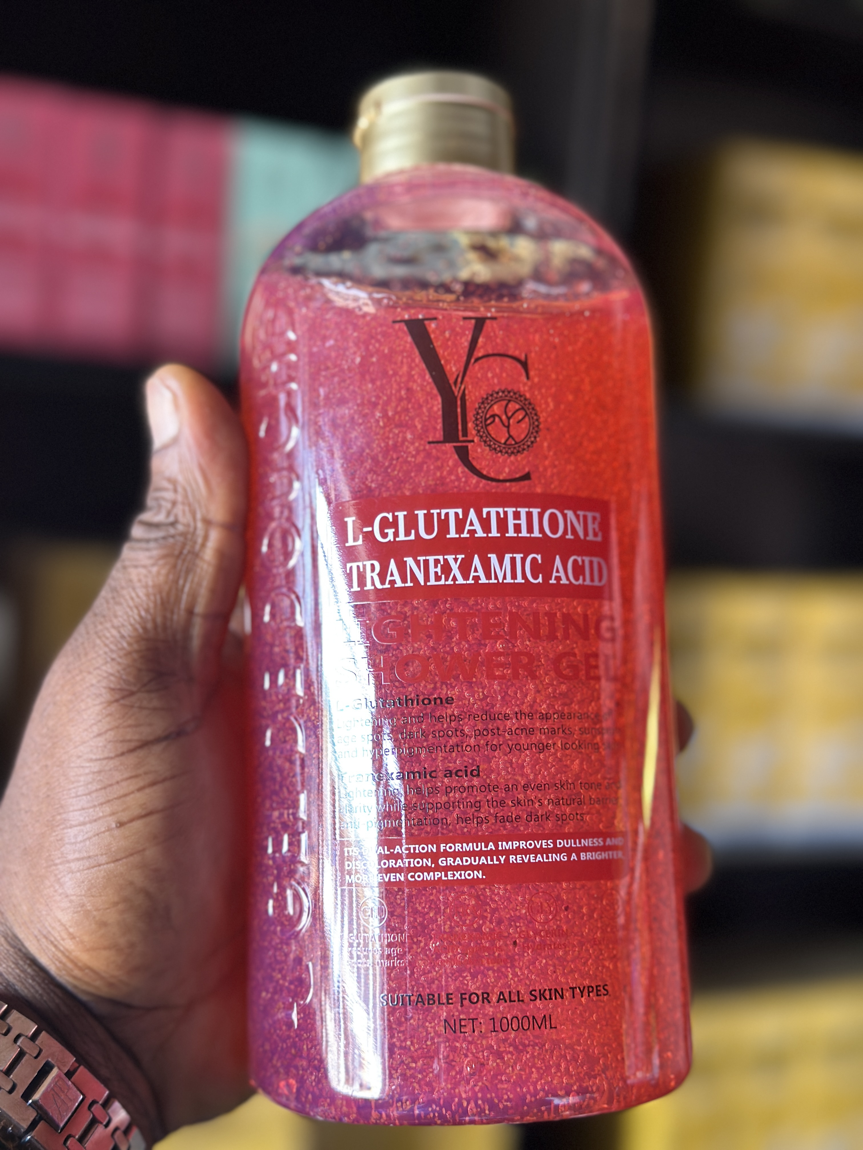The YC Whitening Gold L-Glutathione Shower Gel is a body treatment designed to brighten the skin, reduce dark spots, and provide anti-aging benefits
